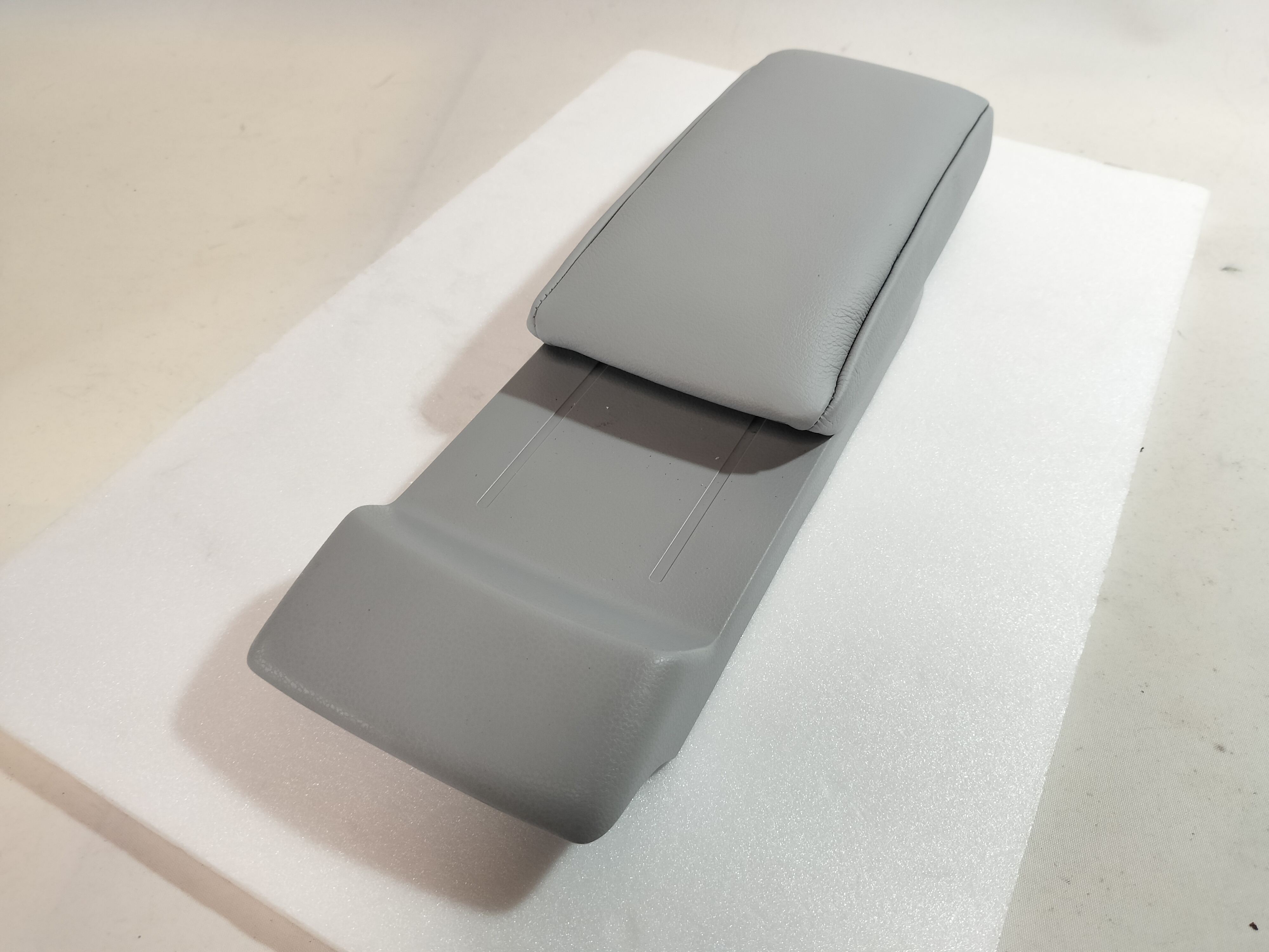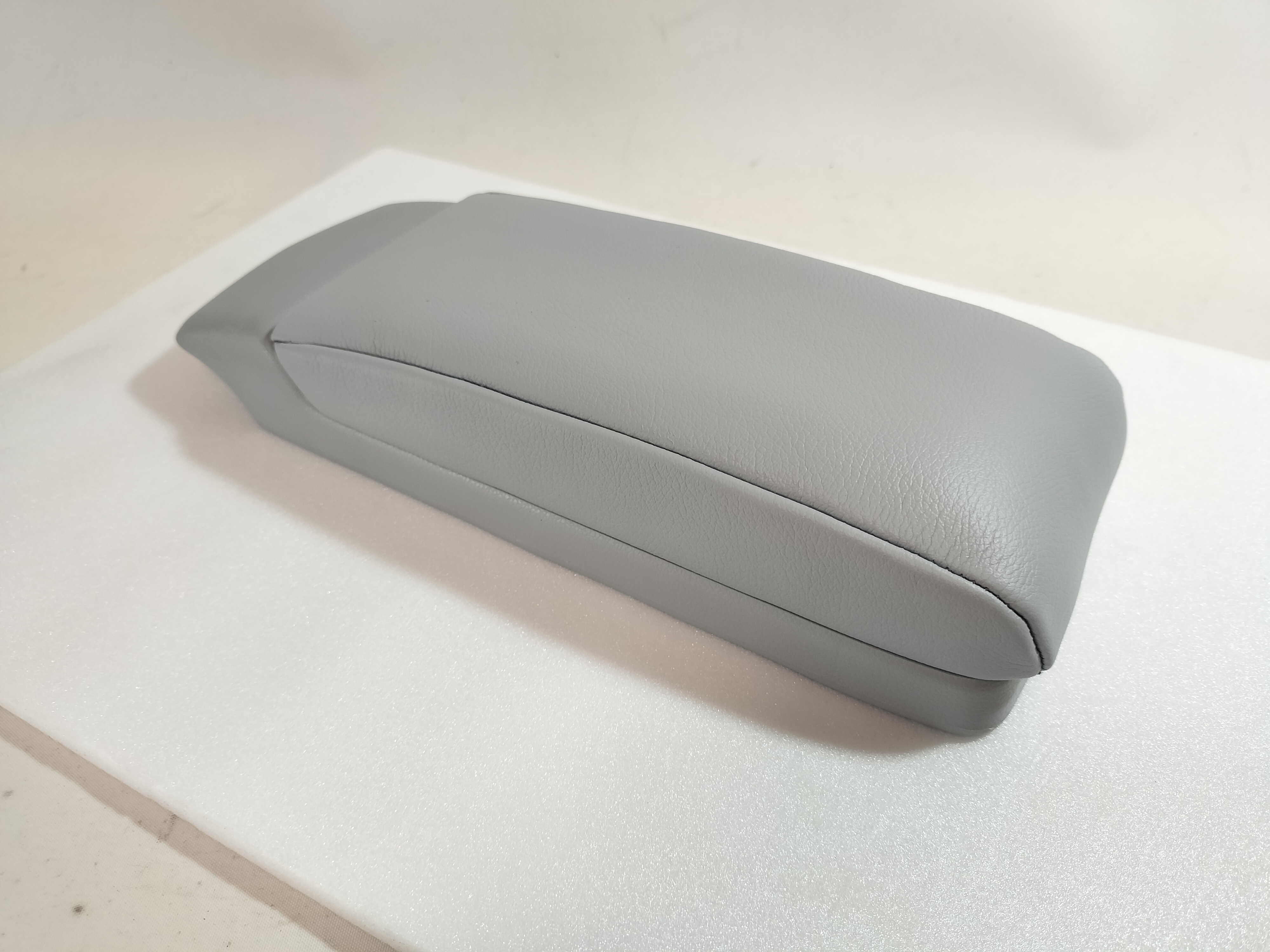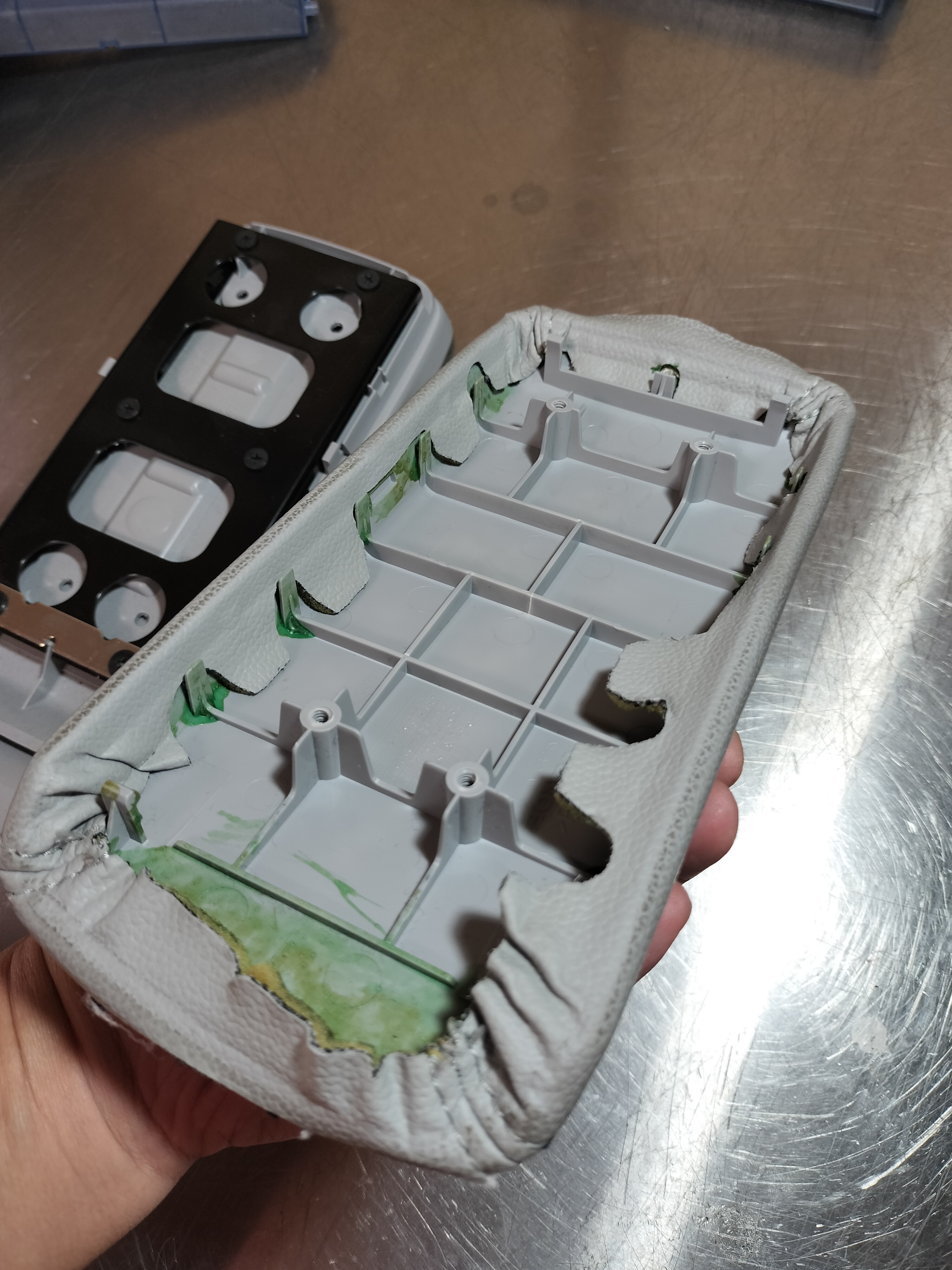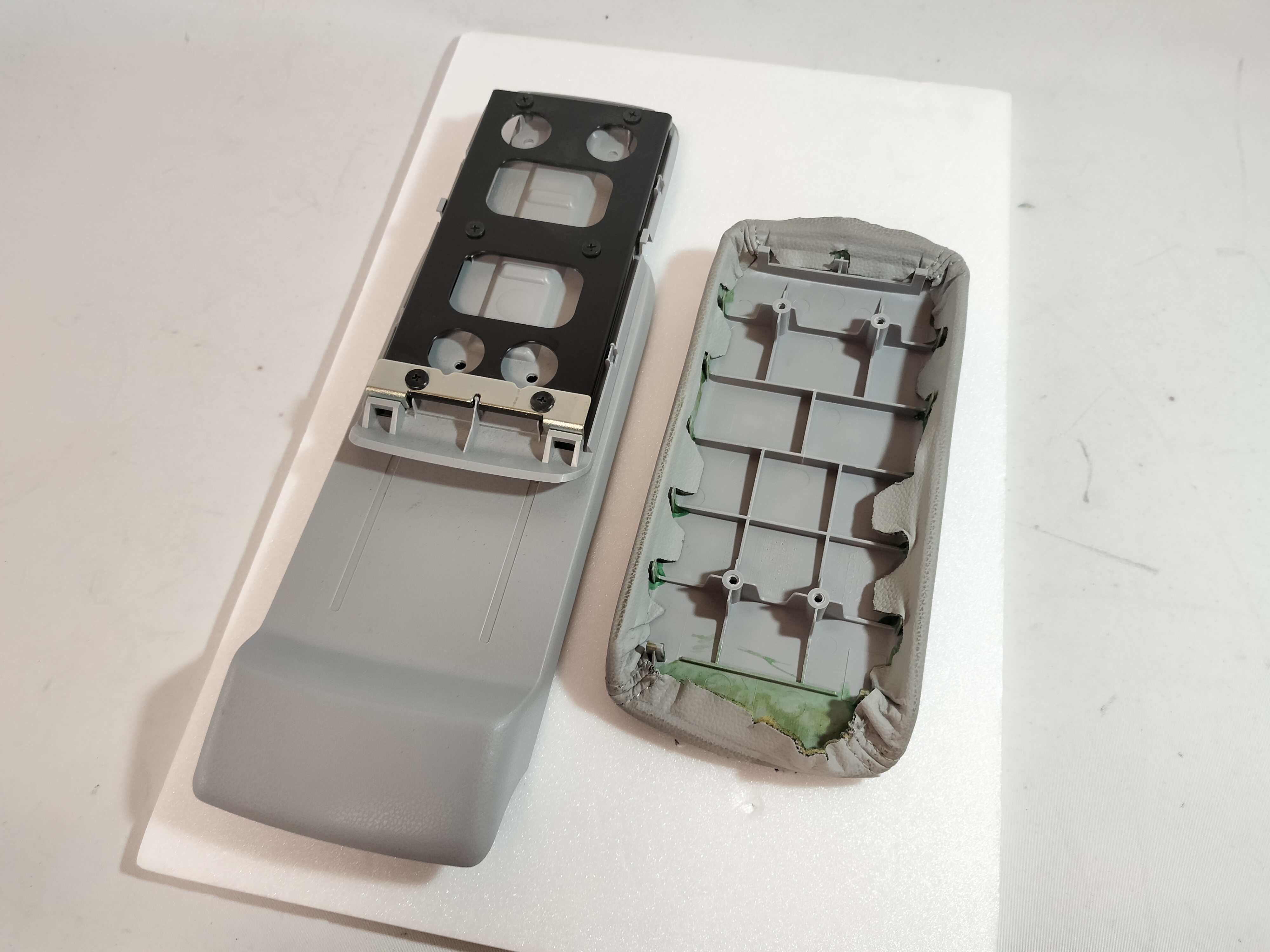 自動車内装部品 アームレストの 本革 張替え です。