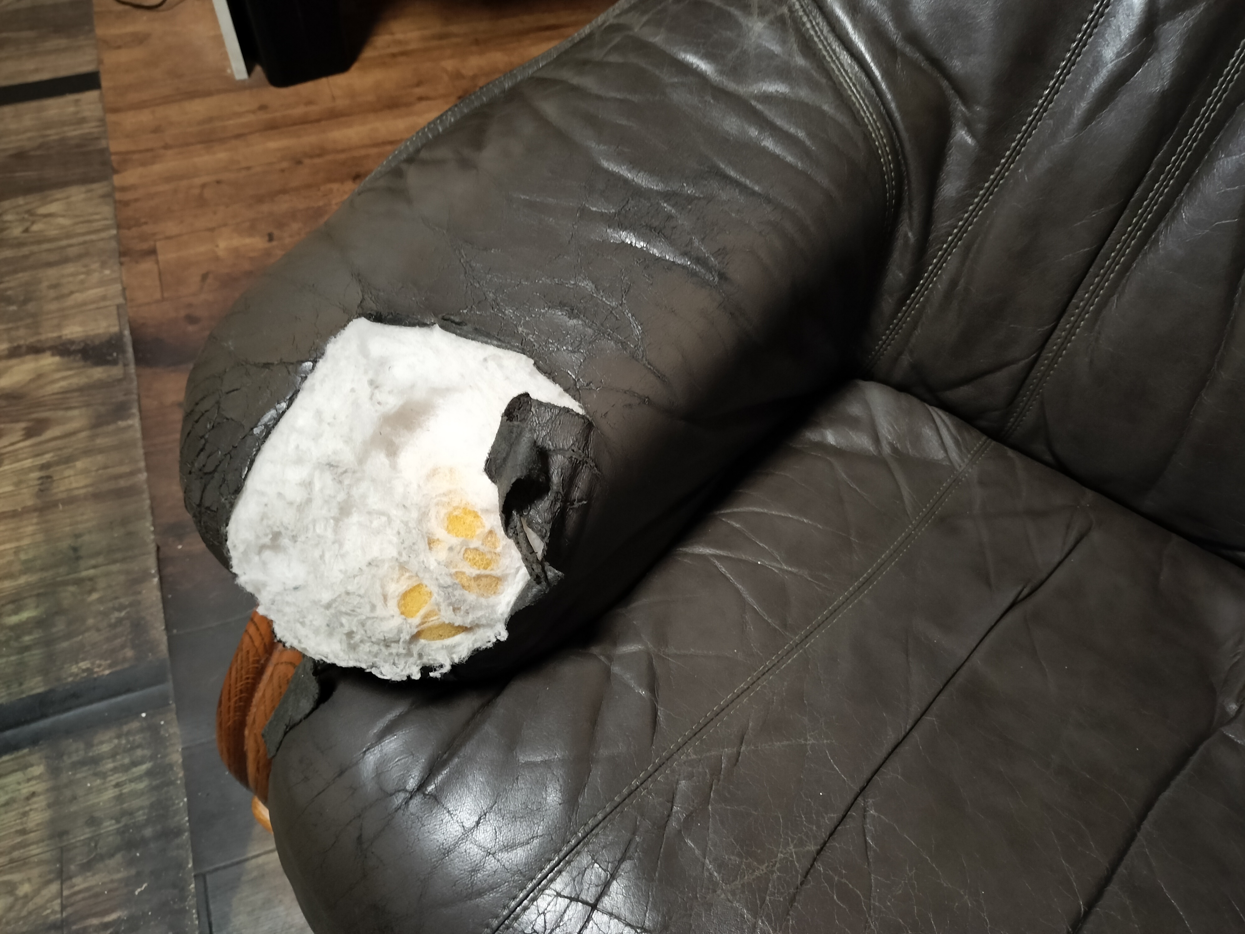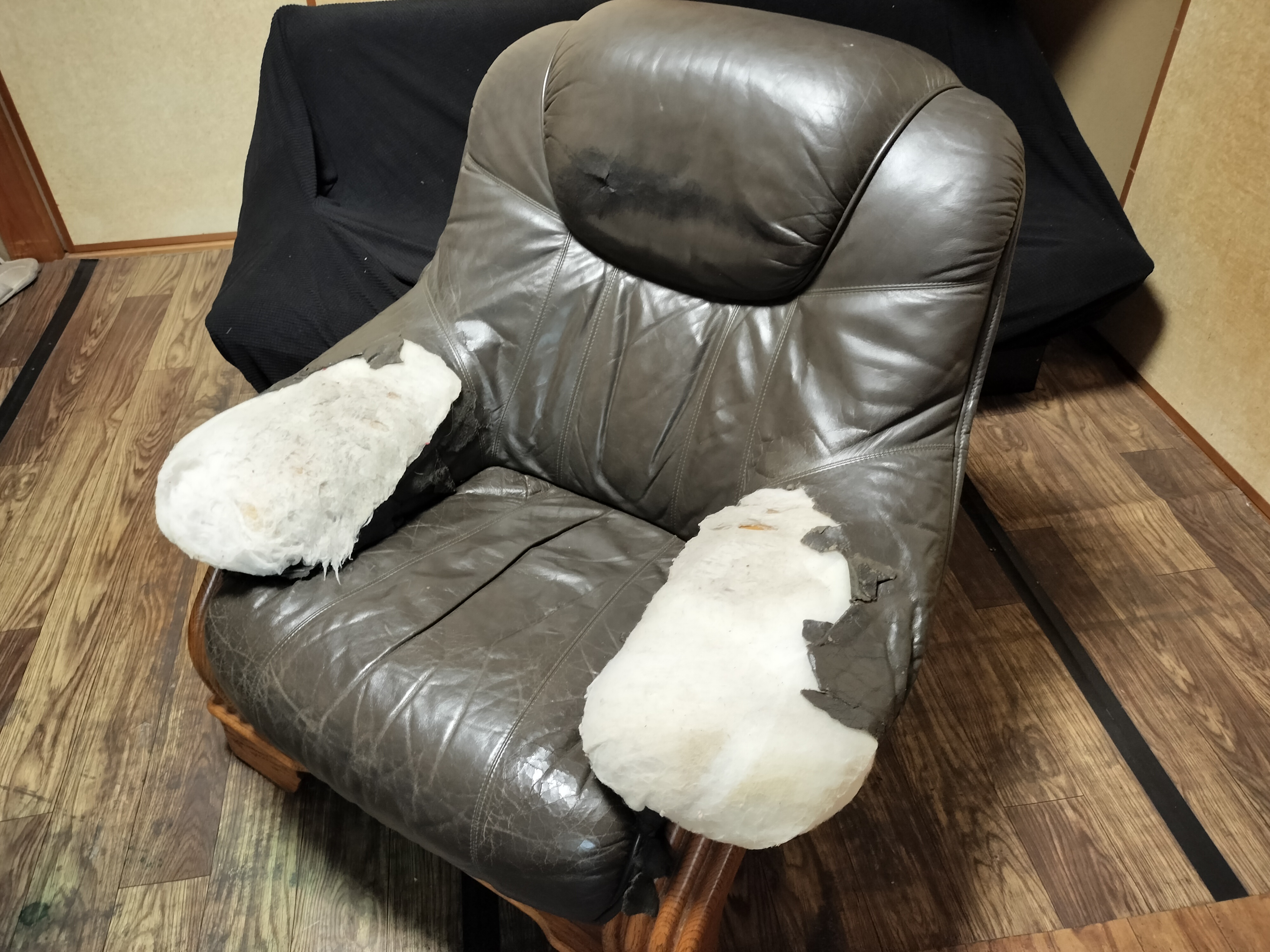 左の肘掛部分ですが、先端と肩のあたりが二ヶ所 5cmづつくらい裂けています。