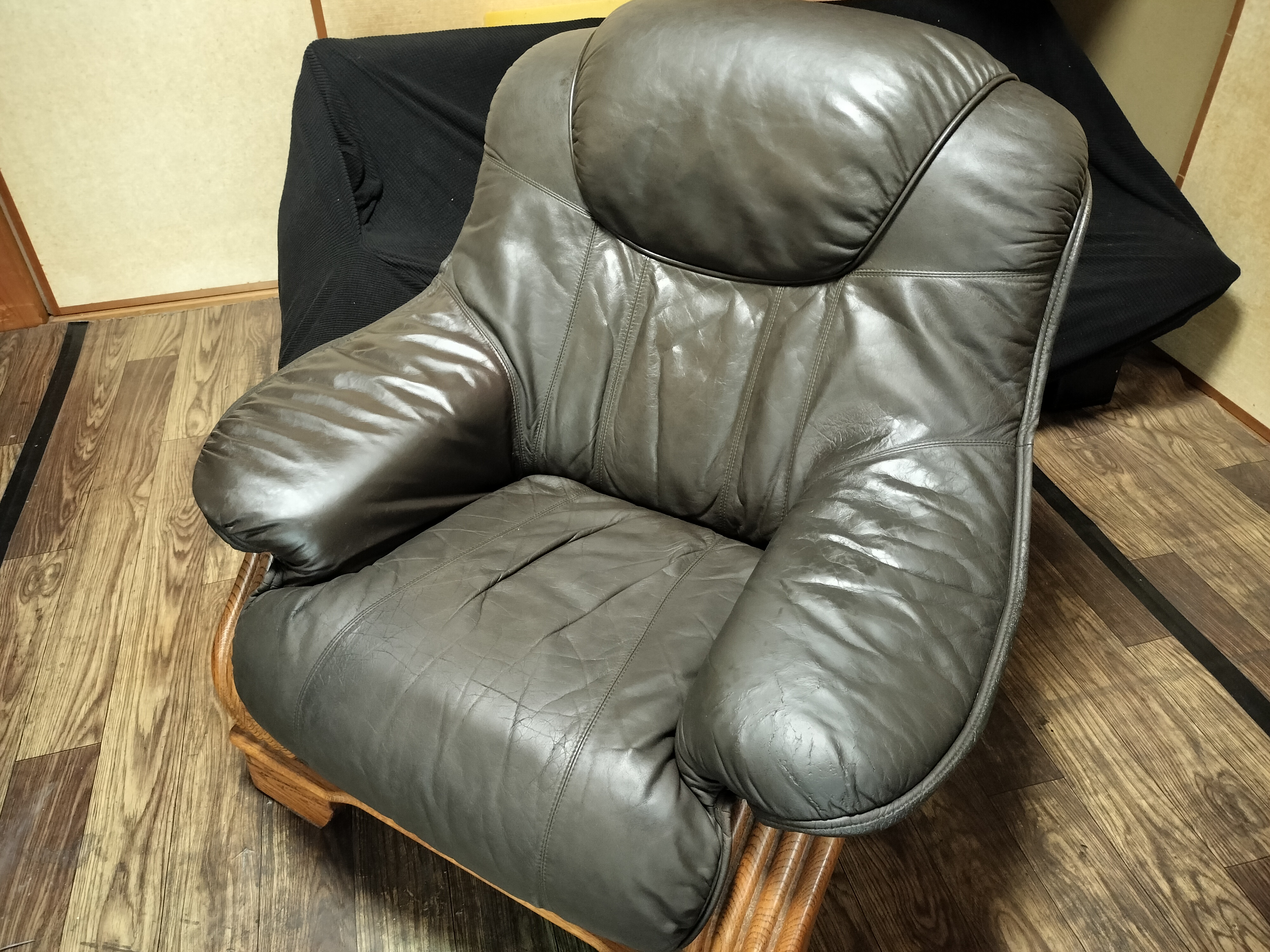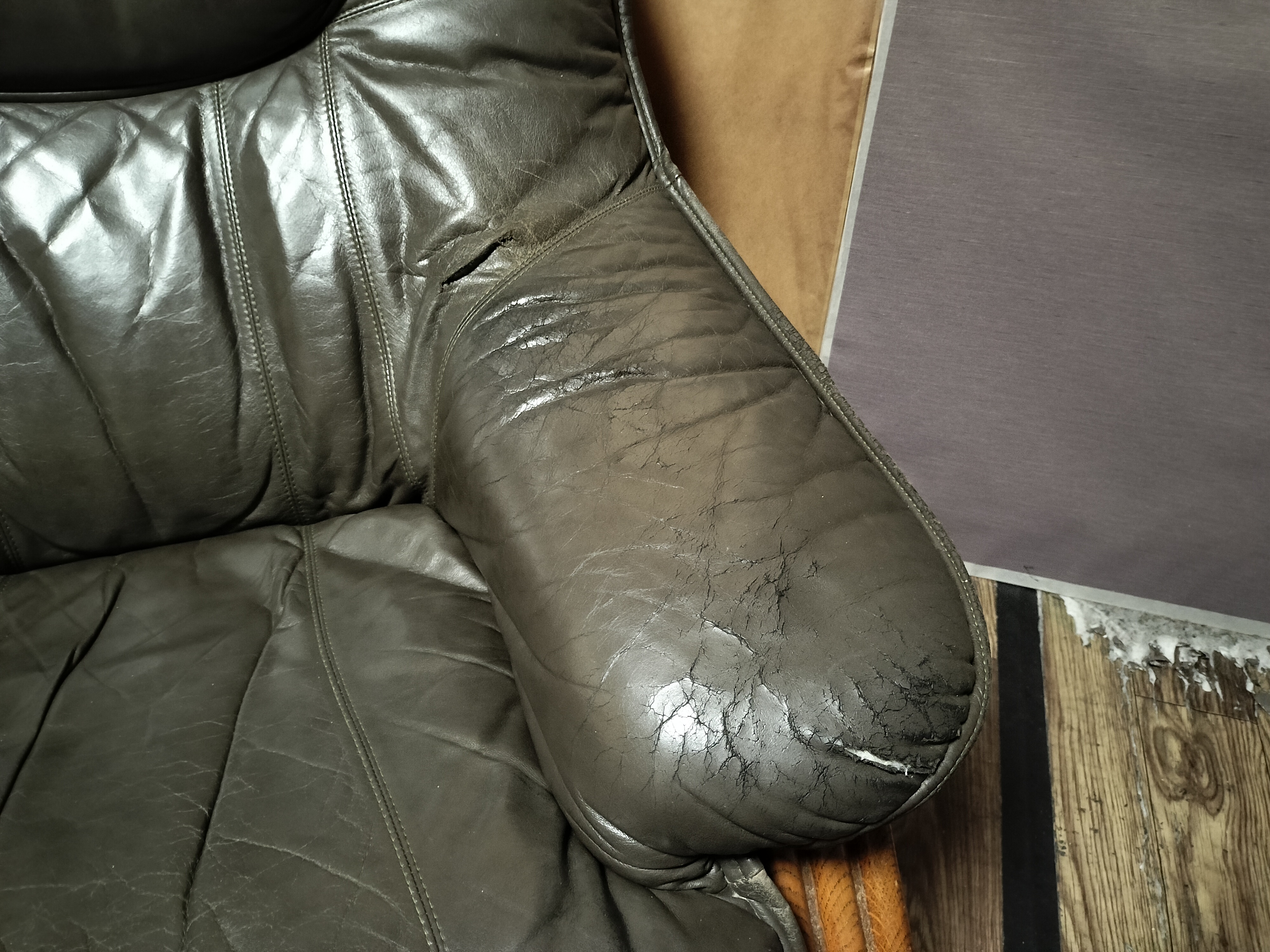 剥がしてみて すぐにわかるのは右の肘掛け部分の先端のめくれと 座面の大きな二本線ですね。