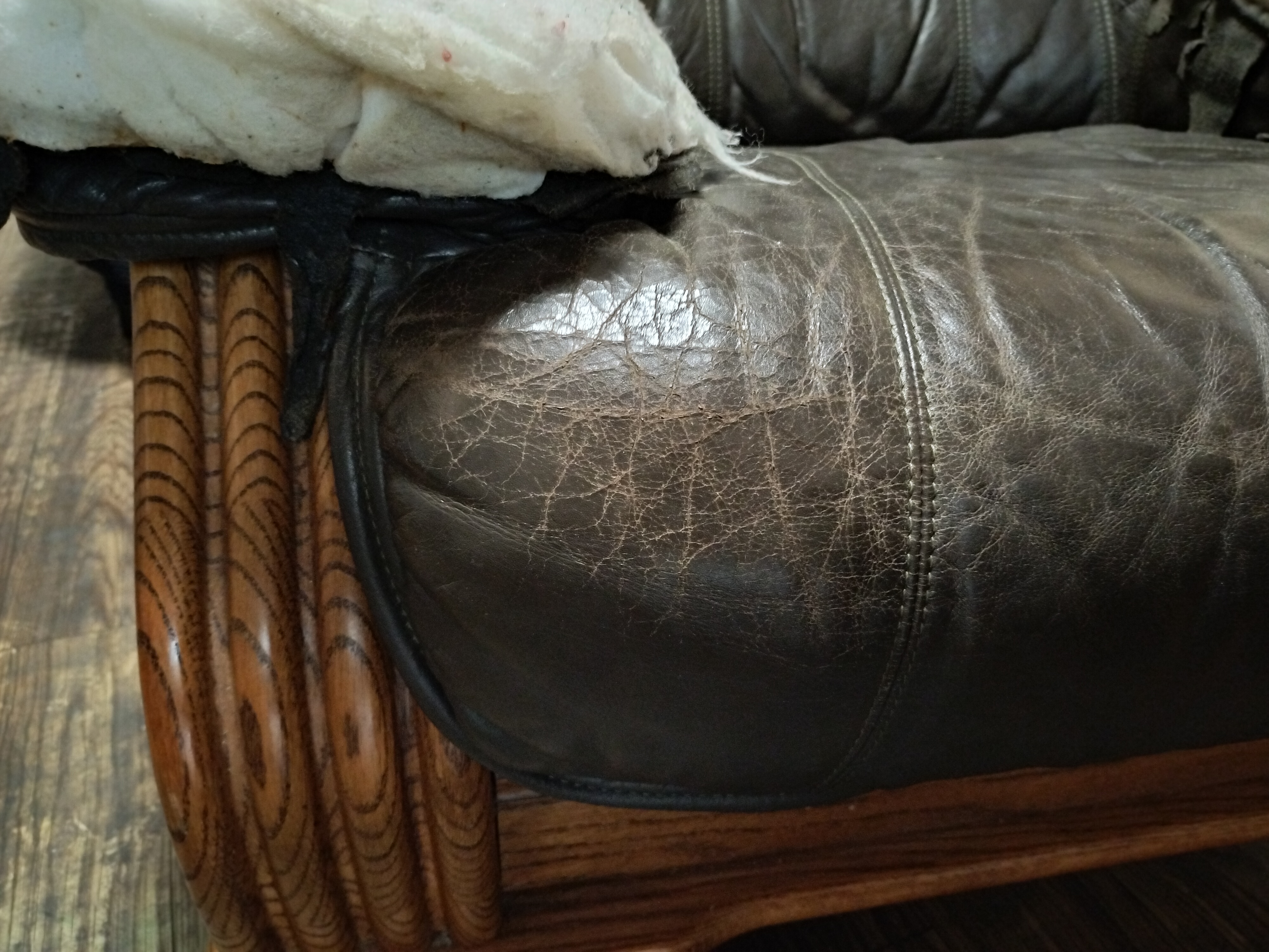 右手の肘掛けは大きく 破れてしまっているので革を交換しますが 左手の肘掛けと首のあたりの裂け目は5cm 程度なので裏に布を当てて修復していきます。