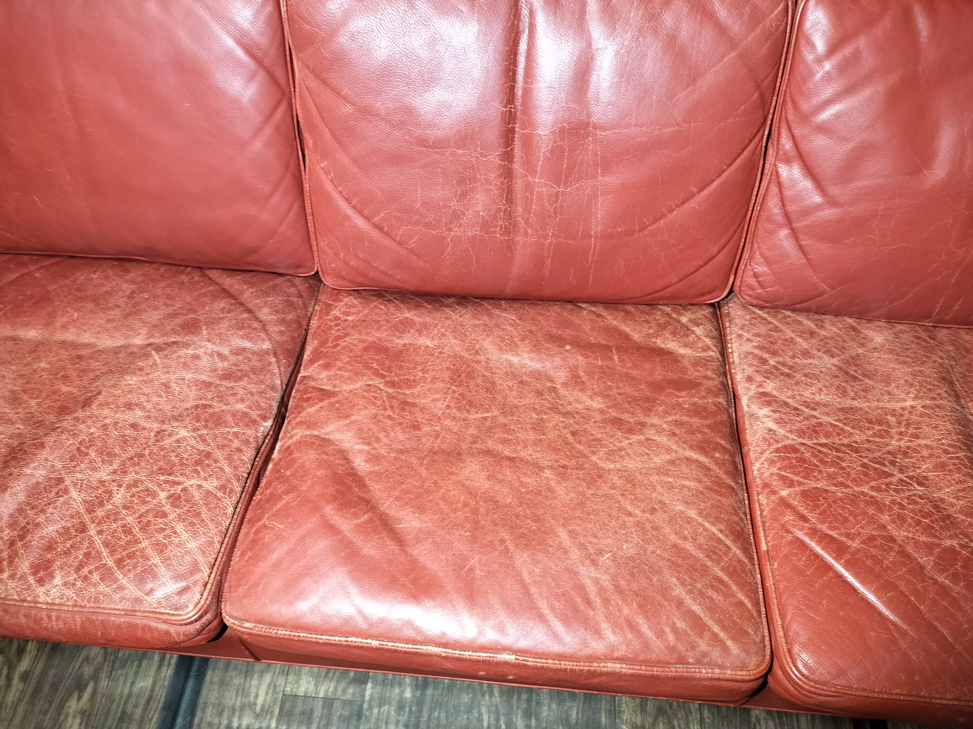 中央に大きなヒビが入っており 革が硬くなって割れたような状態になっています。